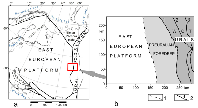 RUSSIAN JOURNAL OF EARTH SCIENCES, VOL. 21, ES3002, doi:10.2205/2021ES000766, 2021 ![]() Figure 1. Tectonic maps Eastern Europe (a) and Western Urals region (b), Russia. Uralian megazones: W – West, C – Central, T – Tagilo-Magnitogorskian. 1 – Western boundary Preuralian foredeep. 2 – Uralian deep faults and their numbers: 1 – West, 2 – Central, 3 – Main Uralian. Copyright 2021 by the Geophysical Center RAS. Generated from LaTeX source by ELXfinal, v.2.0 software package. |