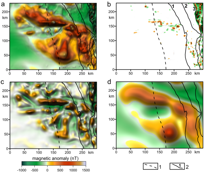 RUSSIAN JOURNAL OF EARTH SCIENCES, VOL. 21, ES3002, doi:10.2205/2021ES000766, 2021 ![]() Figure 3. Magnetic anomalies of the Western Ural region (a) and separated magnetic anomalies from upper layer of the Earth's crust 0–5 km (b), granite layer 5–20 km (c) and basalt layer (d). The designations are shown in Figure 1. Copyright 2021 by the Geophysical Center RAS. Generated from LaTeX source by ELXfinal, v.2.0 software package. |