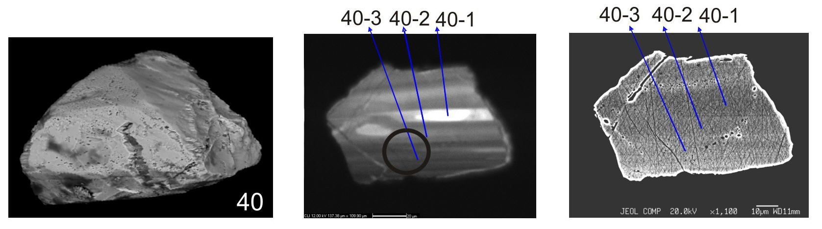 Grain 40. Grain fragment with cavernous surface and (b) coarse zoning.