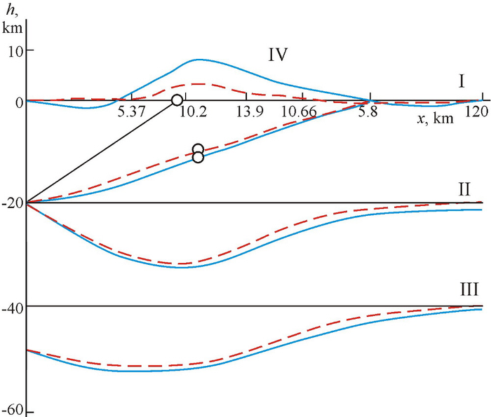 Figure 5. Denudation influence on the boundary's topography in the vicinity of the fault zone. Fault position (I – left of the circle), upper crust (II) and Moho (III), surface relief (IV) without erosion (blue lines) and for the denudation with a rate of 1 mm/yr (red lines) at the end of shortening ($t=7$ Ma). Black solid lines represent the initial boundary's positions. Erosion level (in km) is marked by the numbers under the free surface. Copyright 2015 by the Geophysical Center RAS. Generated from LaTeX source by ELXpaper, v.1.4 software package. |